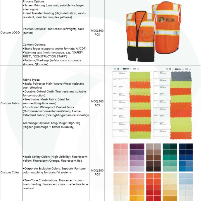 A1: Full-dimensional customization is supported, including: logo, text and pattern customization (screen printing, heat transfer printing and embroidery processes optional); color customization (full RAL color system adapting to corporate VI); style customization (regular/slim/plus size/children's); reflective strip customization (material, width, arrangement); functional accessory customization (pockets, Velcro, zippers), and customized plans can be combined on demand.